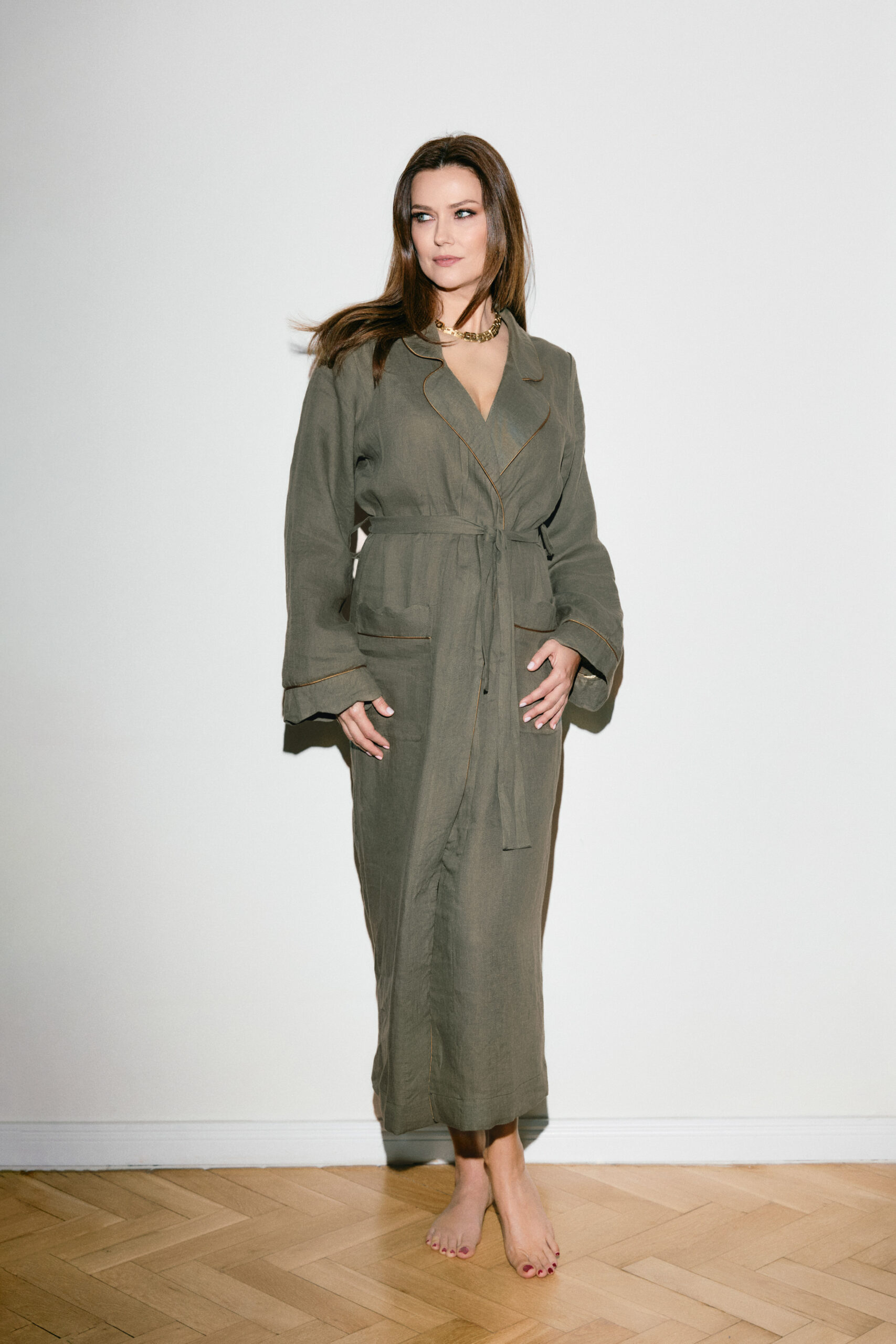 A refined linen robe in a soft khaki tone — breathable, elegant, and effortlessly feminine. Made from 100% linen, it's the perfect blend of comfort and natural sophistication for your quietest, most cherished moments.
