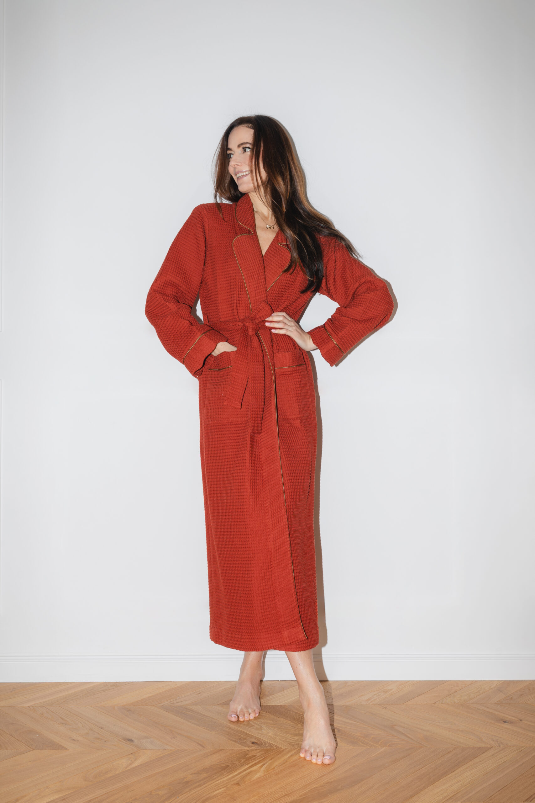Lekki, miękki i wyjątkowo stylowy. Ten waflowy szlafrok w eleganckim odcieniu terracotta, wykonany w 100% z przyjemnej w dotyku bawełny, otula ciepłem i zapewnia komfort na co dzień. Stworzony z myślą o kobietach, które szukają harmonii między luksusem a funkcjonalnością.